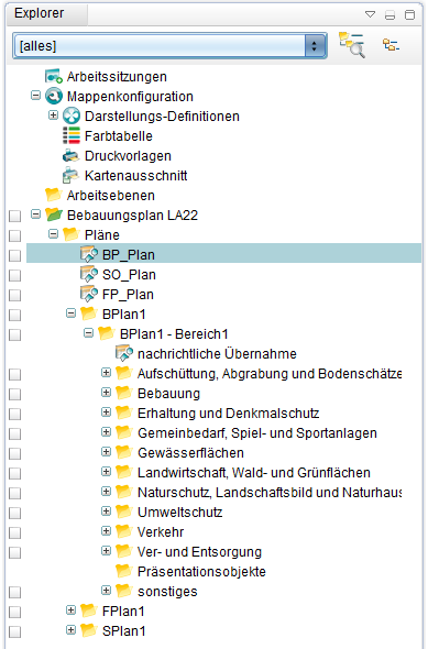Es gibt aktive und inaktive Pläne/Objekte. Im Auskunftmodus werden nur aktive Objekte dargestellt, welche über einen eigenen Explorerteilbaum gefiltert werden. Daneben gibt es für jeden Plan (aktiv oder inaktiv) einen eigenen Explorerteilbaum.